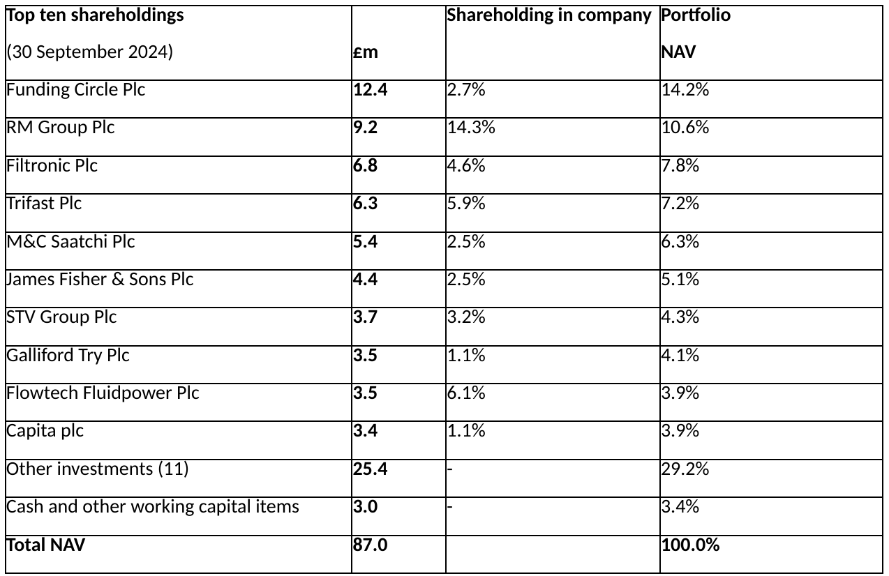 “NAV Total Return performance in the three years to 30th September 2024 of 48.5% which compares to declines in the FTSE AIM All Share Index of -40.5% and the FTSE Small Cap (ex-ITs) Index of -5.8%. The Total Shareholder Return in the same three-year period was 68.0%.”